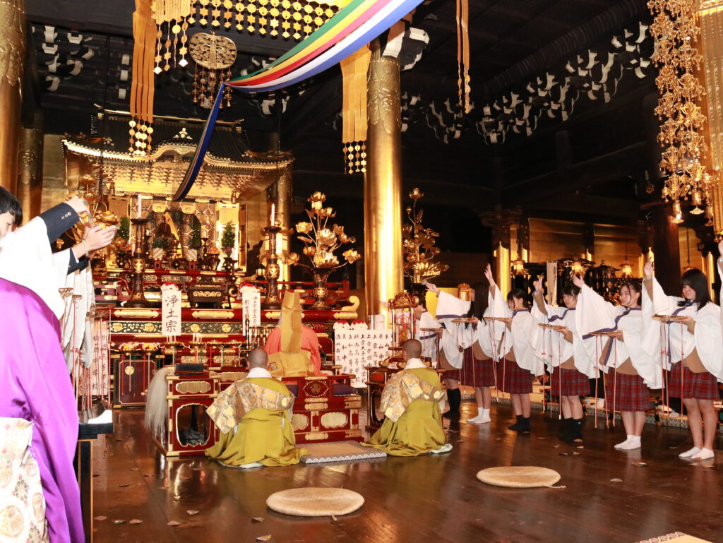 はじめに、青少年に向けた浄土宗のメッセージが発出され、続く音楽法要では、7曲の仏教聖歌を、御影堂に集まった学生、教職員が声をあわせた。